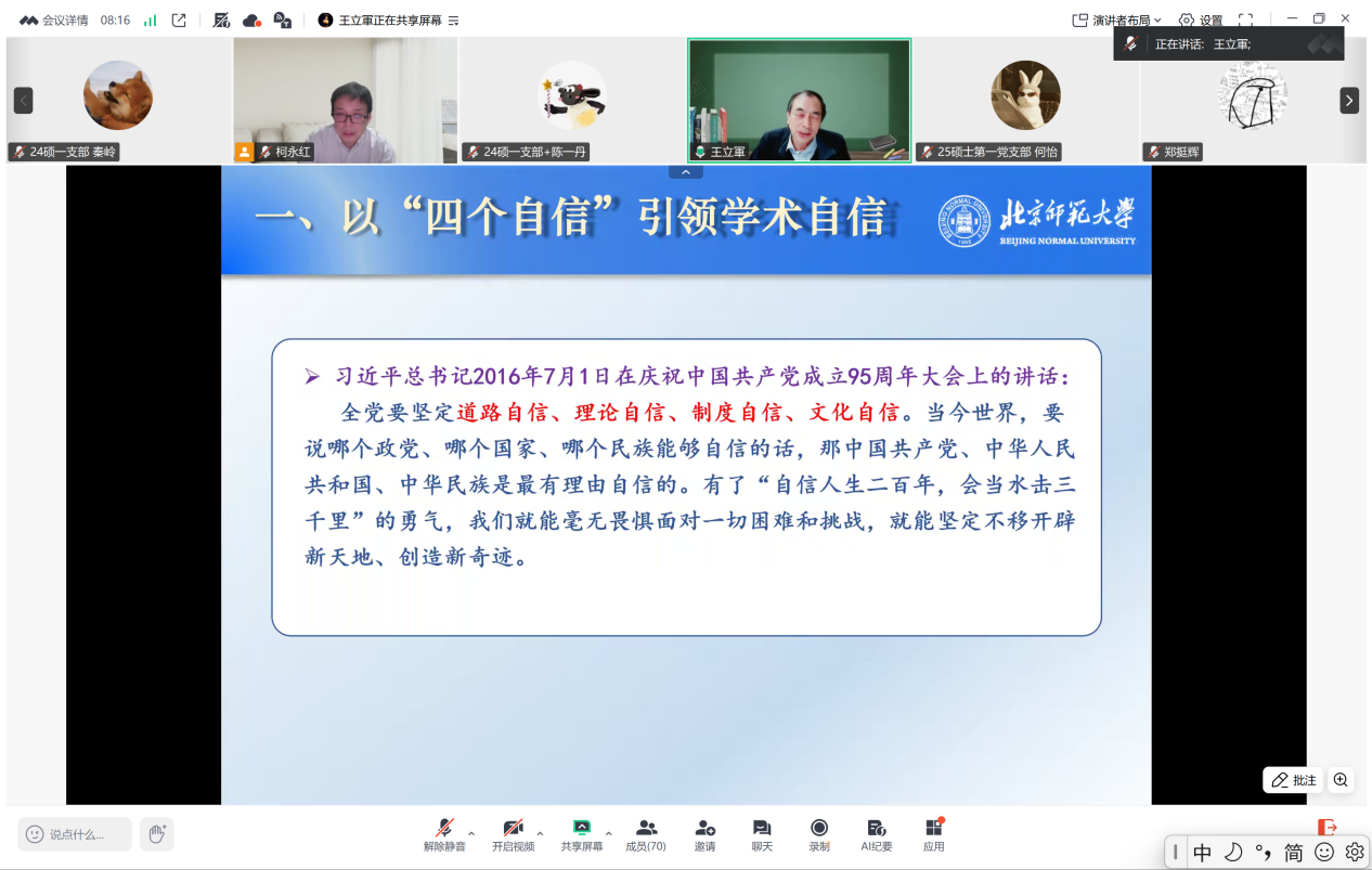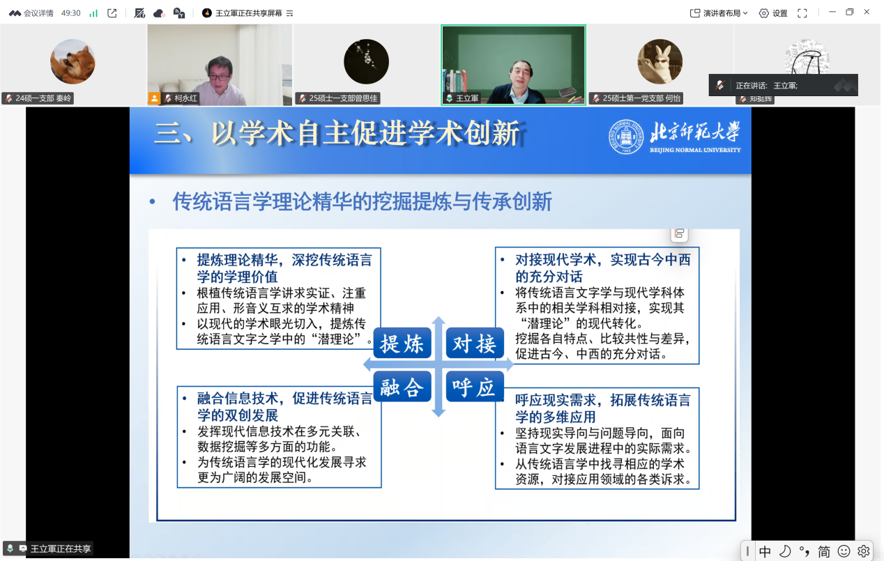 古代汉语研究所教工党支部与研究生党支部联合开展共建活动,邀请古代汉语教师党支部的王立军老师主讲线上党课——“汲取传统语言学精华,坚持学术自主自信”。活动由古代汉语研究所教工党支部书记柯永红老师主持,来自2023级、2024级、2025级的70余名硕士研究生党员和入党积极分子共同参加了此次党课学习。