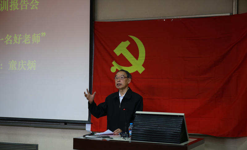 资深教授童庆炳先生以《做四有好老师,为党和人民培育英才》为题做了首场培训报告。报告会持续了近两个小时,童先生在报告中结合自身的从教经历,以幽默风趣的语言阐释对“四有”好老师的理解。童先生的报告真诚又亲切,娓娓道来,让在场所有老师和同学都深受感染,场内数次响起热烈的掌声。作为一位有着60年党龄的老党员,童先生用自己亲身经历为“四有”好老师做了最生动的注解。