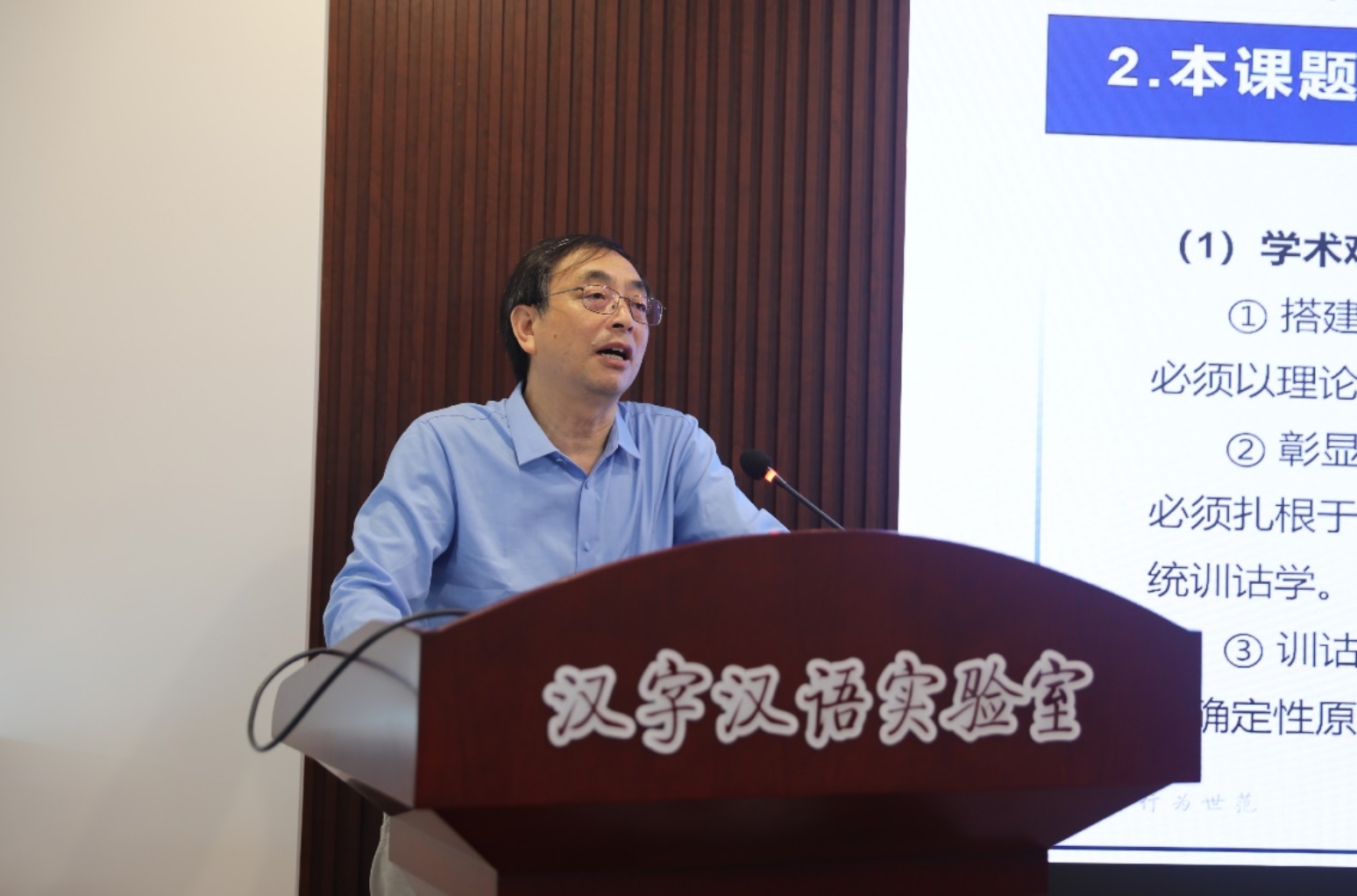 党委书记周云磊出席会议并致辞。评议专家组由中国社会科学院大学张江教授、中国社会科学院大学李红岩教授、北京语言大学董志翘教授、北京语言大学冯胜利教授、北京语言大学华学诚教授、上海师范大学徐时仪教授、中国人民大学王贵元教授、北京大学孙玉文教授、清华大学李守奎教授组成。评议专家组组长中国社会科学院大学张江教授主持开题论证会。