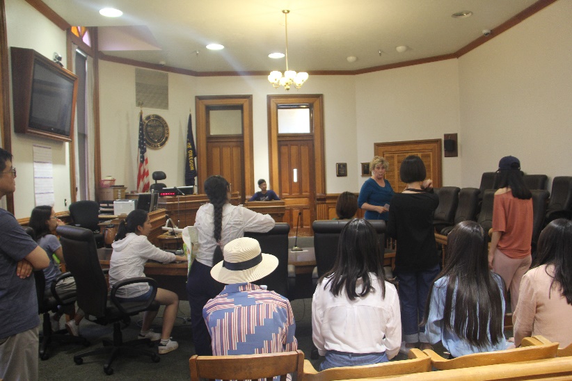 来到俄勒冈州立大学的第一个周末,薛磊老师、陈悦老师与Ray教授带领同学们深入感受了美国西部的自然风光与当地特色,以及科瓦利斯城区的行政基层组织架构与消费文化。第一天上午,徒步旅行。美国西部的风光与国内抬眼所见大不相同,同学们徒步登山,半山腰处有一望无际的金黄色牧草,Ray教授告诉我们,翻过眼前这座Mary’s Peek,就是太平洋。此后,又组织同学们去了McDonald Forest徒步,地理空间距离的无限拉近,让同学们大开眼界。下午,老师们带领同学们去了当地的蓝莓采摘园,感受科瓦利斯独具特色的农业文明。第二天,组织了去科瓦利斯法院、监狱、奥特莱斯的Field Trip。工作人员都十分热情,为同学们介绍他们工作的内容与意义,耐心回答大家的问题;校方也邀请了知名法官与同学们面对面,在这样难得的机会面前,同学们都踊跃提问,询问关于科瓦利斯地方立法与执法机关的性质与结构分支,以及从事法官这一职业的体会与感受。