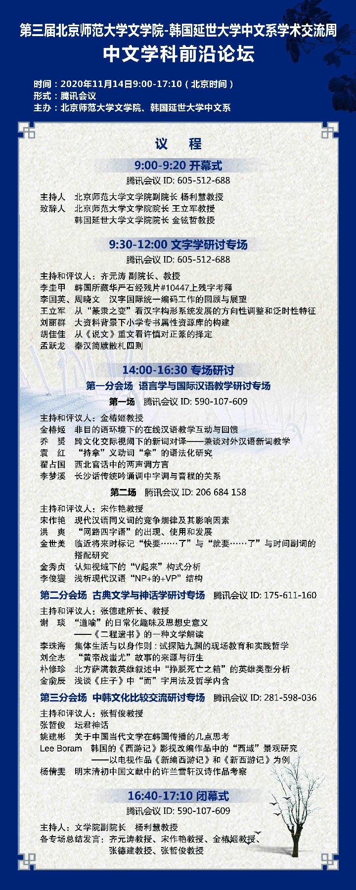 -韩国延世大学中文系学术交流周·中文学科前沿论坛”成功举行。来自两院系的28位中韩学者和博士研究生分为五个专场,在一整天的时间里,通过腾讯会议,围绕着文字学、古代文学和神话学、语言学和国际汉语教学以及中韩文化比较交流等学术领域,进行了在线论文发表和讨论交流。近300人次的听众参与了此次国际学术研讨活动。