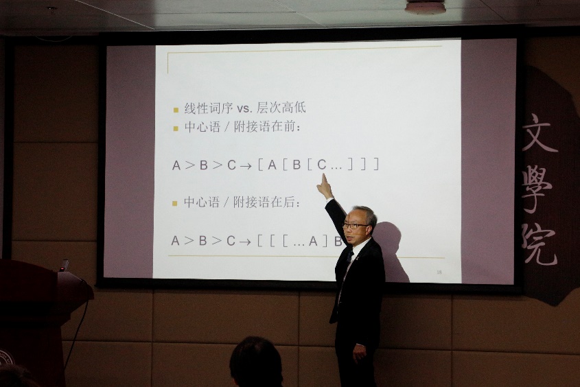 在简短却非常热烈的聘书颁发仪式后,邓思颖教授为在场师生带来了题为“当制图理论遇上汉语语法”的精彩讲座。邓思颖教授分别从句法结构中的三个层次,即词汇层次、屈折层次和标句层次,运用普通话和粤语的丰富研究和大量语料,深入介绍了制图理论的研究方法、研究案例以及对汉语语法乃至语言共性研究的重要意义。