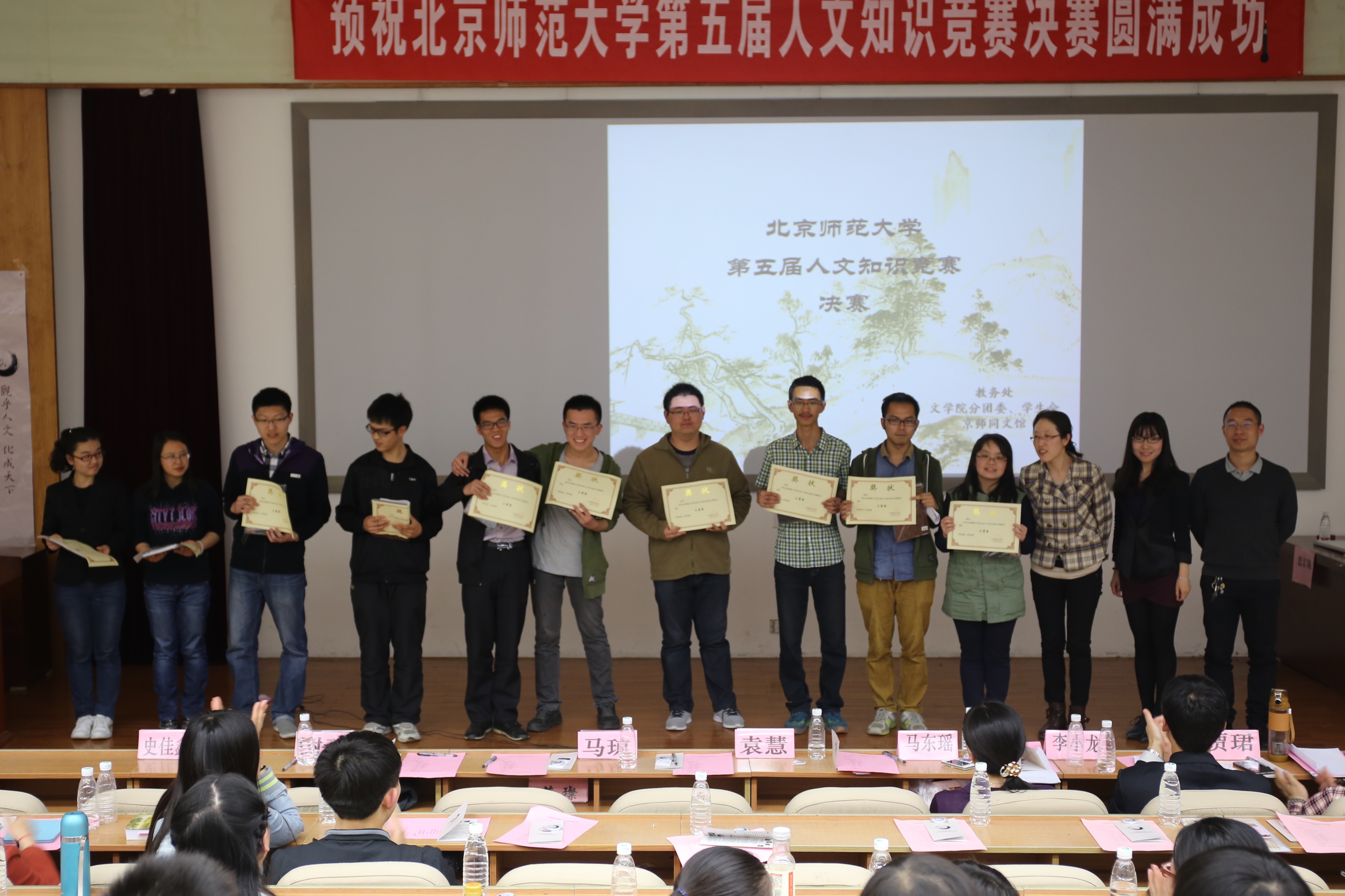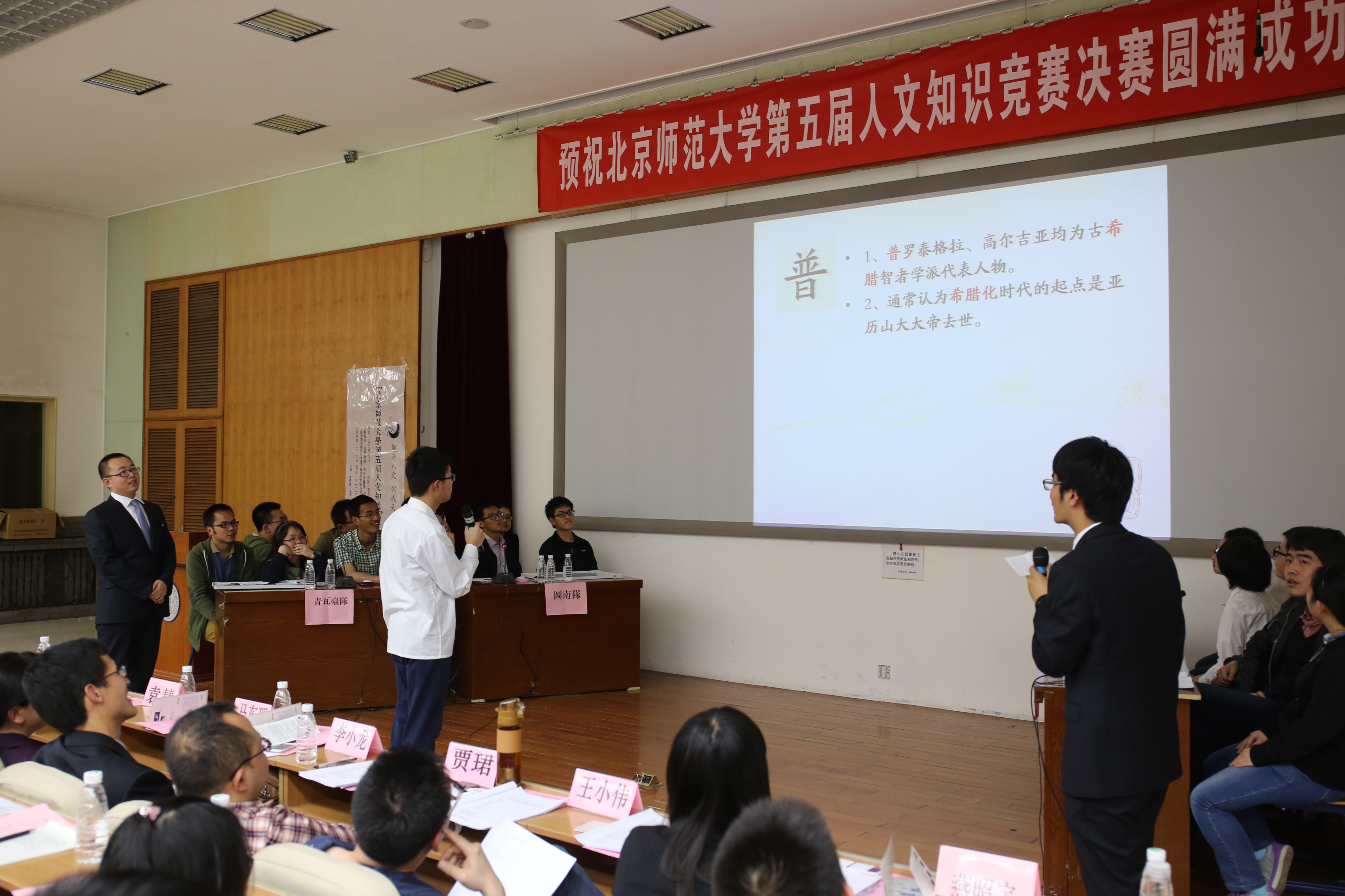 古代文学研究所李小龙老师,历史学院贾珺老师,哲学学院王小伟老师以及曾代表北师大参加第四届北京市人文知识竞赛的队长崔一非师姐。