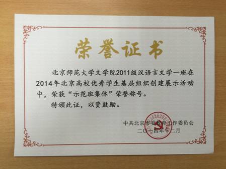 2011级汉语言文学一班荣获“示范班集体”荣誉称号,2012级文艺学班荣获“优秀基层组织”荣誉称号。