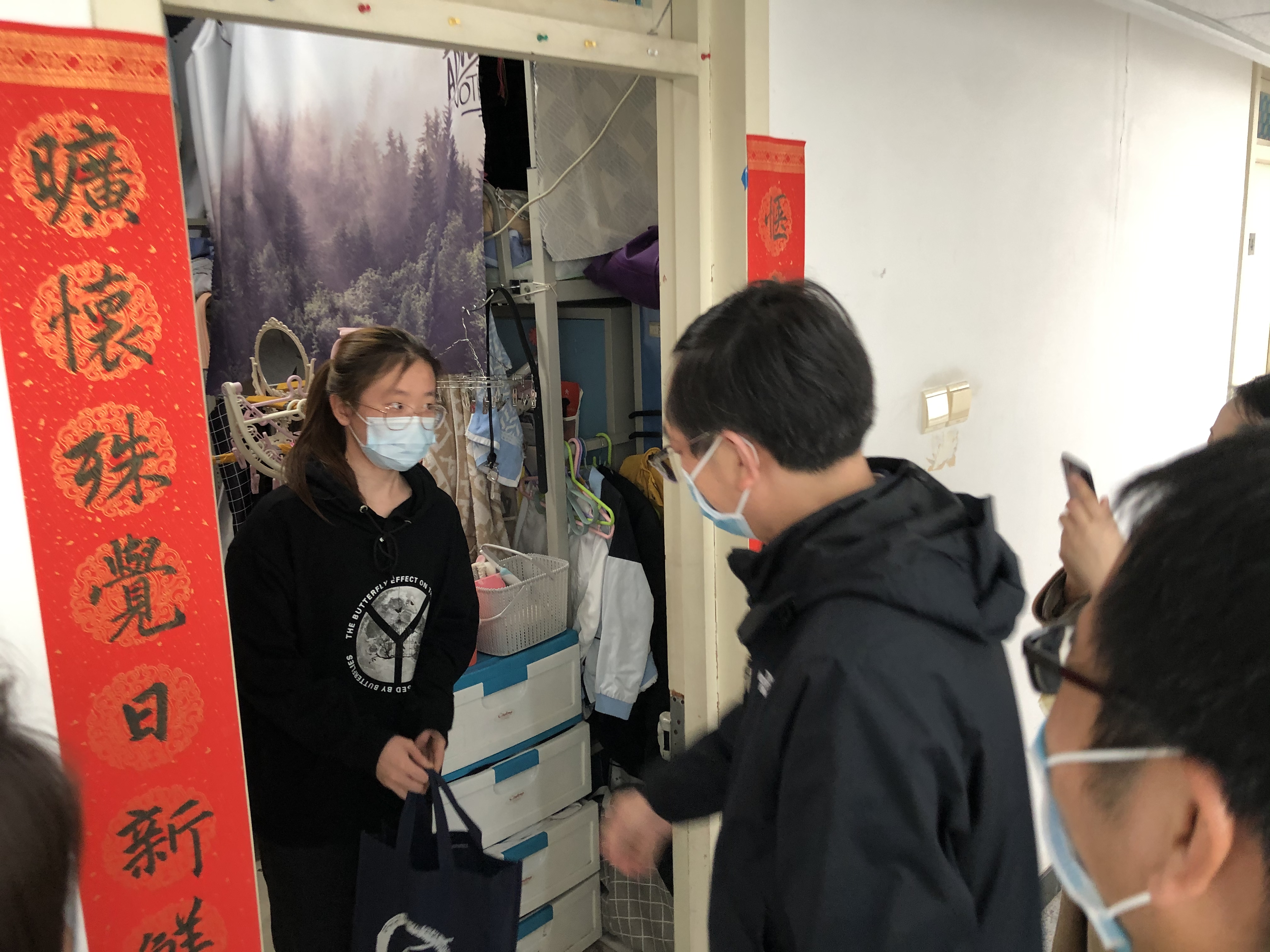 院领导先后走访了2018级本科生居住的学5宿舍楼和2019级硕士研究生居住的学16宿舍楼,了解同学们的留校原因和近期情况,认真听取了同学们的反馈意见,并就同学们在学业和生活中遇到的问题作了交流。随后向同学们赠送学院春节慰问礼包,并预祝同学们新春快乐。院领导鼓励留校同学珍惜时光,叮嘱大家劳逸结合,与同学共同度过一个特殊的团圆年。同学们表示在学校过年是很新奇的体验,通过学校和学院组织的各项活动体会到了大家庭的关心和温暖,将继续努力学习,不负韶光,度过一个充实快乐的寒假。