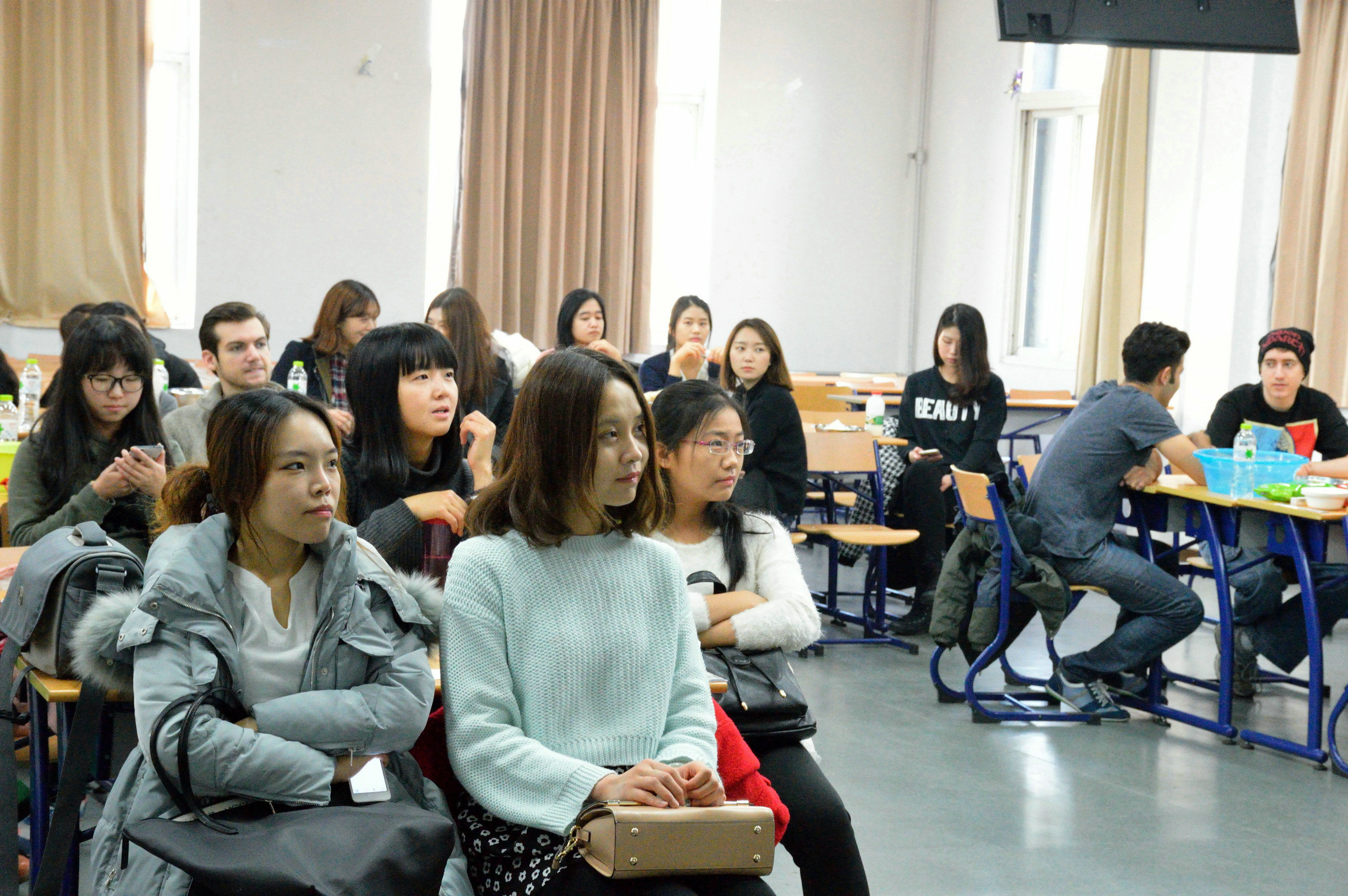 活动伊始,中外学生一起观看了《舌尖上的中国》中关于陕西挂面、饸烙面、重庆小面的精选片段。影片中的面条晶莹剔透,汤汁浓郁诱人,激发了大家对中国面文化的浓厚兴趣。随后,活动进入知识问答环节,学生们就中国面条的起源、种类、演化历史、风土人情、制作工艺等问题进行小组讨论并举手发言,发言者赢得了举办方精心准备的中国风系列礼品。
