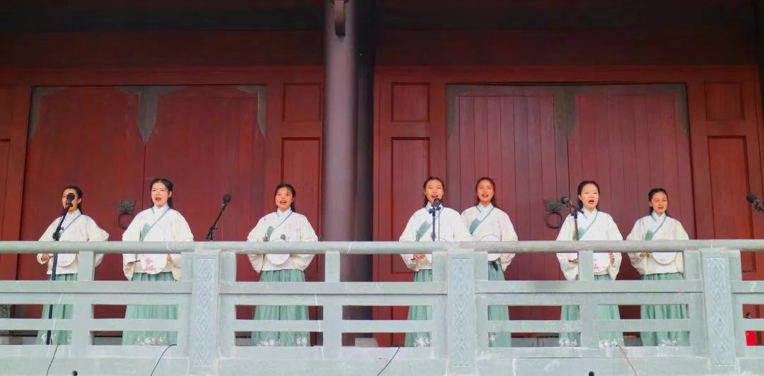 南山诗社则围绕始自楚辞中沧浪之歌的中国古代文人的渔夫情怀,选取了白朴的《沉醉东风·渔夫》、郑板桥的《道情》以及楚辞中渔夫所歌《孺子歌》进行精心编排,作为本次参与展演的节目。来自南山诗社的十二名同学或操琴,或执铃铛、木鱼,或撑伞,或持扇,以吟唱的形式,用动人的音乐,将渔夫闲看秋江、与沙鸥白鹭为伴的清闲生活以及士大夫怀才不遇的愤懑心情一同生动呈现在观众面前。