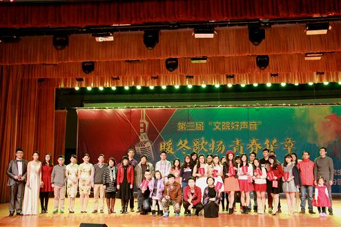 12月10日晚上六点半,第三届“文院好声音”决赛在学生活动中心举行。10名决赛歌手经过选手独唱、组合对唱、大众评审、微信投票等环节角逐,最终,9号选手常宇峰、邢楷的“新生活运动”组合摘得冠军,季军和亚军分落7号选手王檬和10号选手张华,4号选手侯润婕、2号选手陈唯莹则把最佳人气奖揽入怀中。
