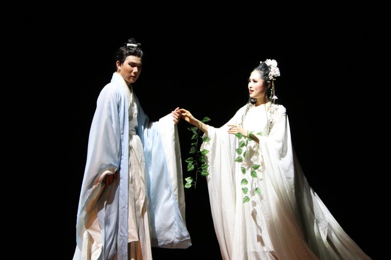 伴随着精彩的故事表演,南山诗社歌队化身仙君与江水,在民乐队优美的现场演奏中,先后吟唱了数首屈原的经典诗赋作品,包括《云中君》《思美人》《楚丘游猎》《东皇太一》《山鬼》《橘颂》《招魂与流民》《国殇》《汨罗江水》等。南山诗社通过诗词吟唱的方式呈现了原汁原味的《楚辞》原文,回顾了伟大的爱国主义诗人屈原跌宕起伏、九死不悔的一生。