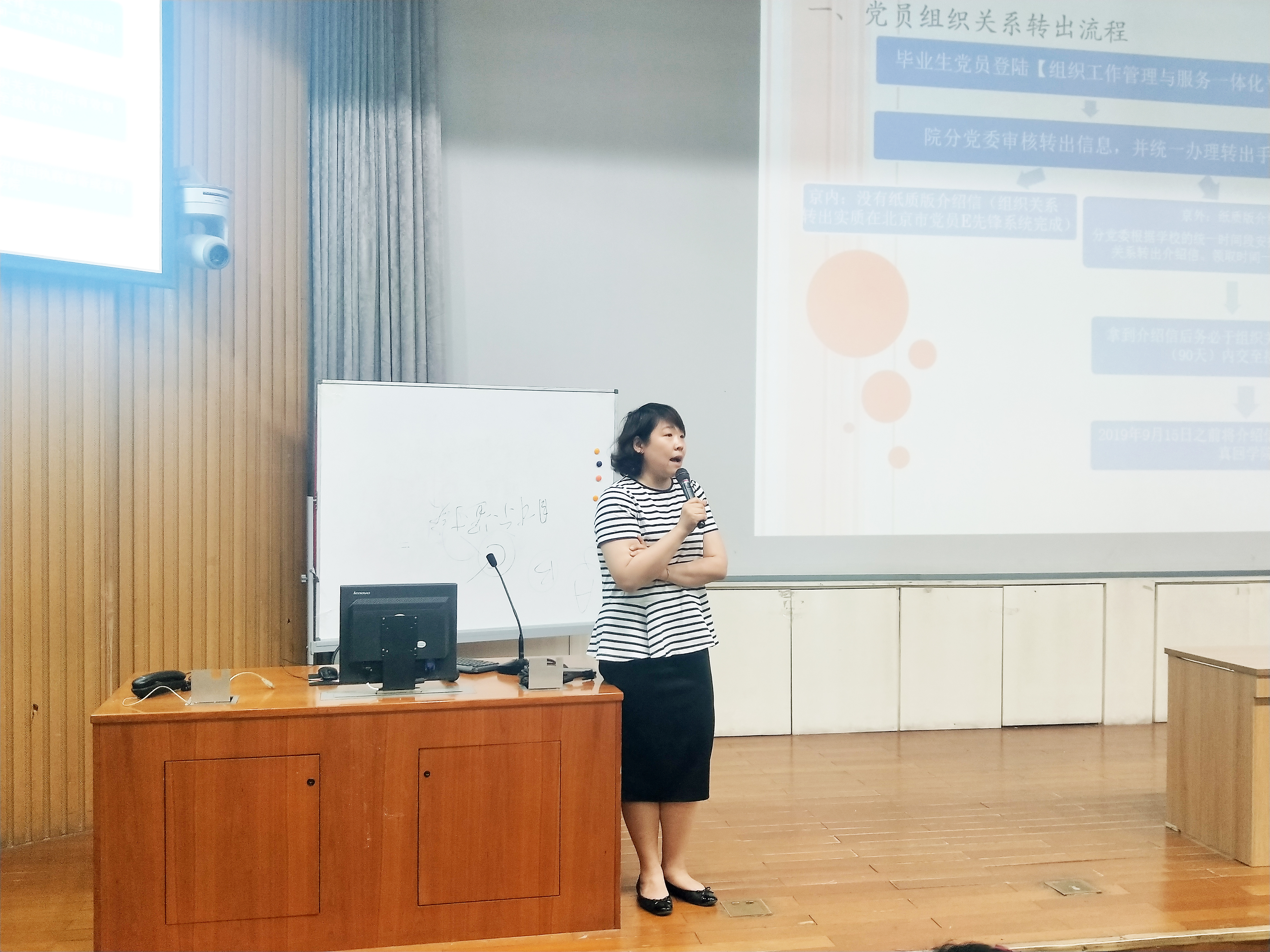 纪婧老师讲解了党组织关系转出的流程及注意事项,包括党员组织关系转出流程、党员组织关系系统填写说明、党员组织关系转出要求及党员E先锋系统使用说明,对不同毕业去向对应的党员组织关系转接类别作了详尽的说明。